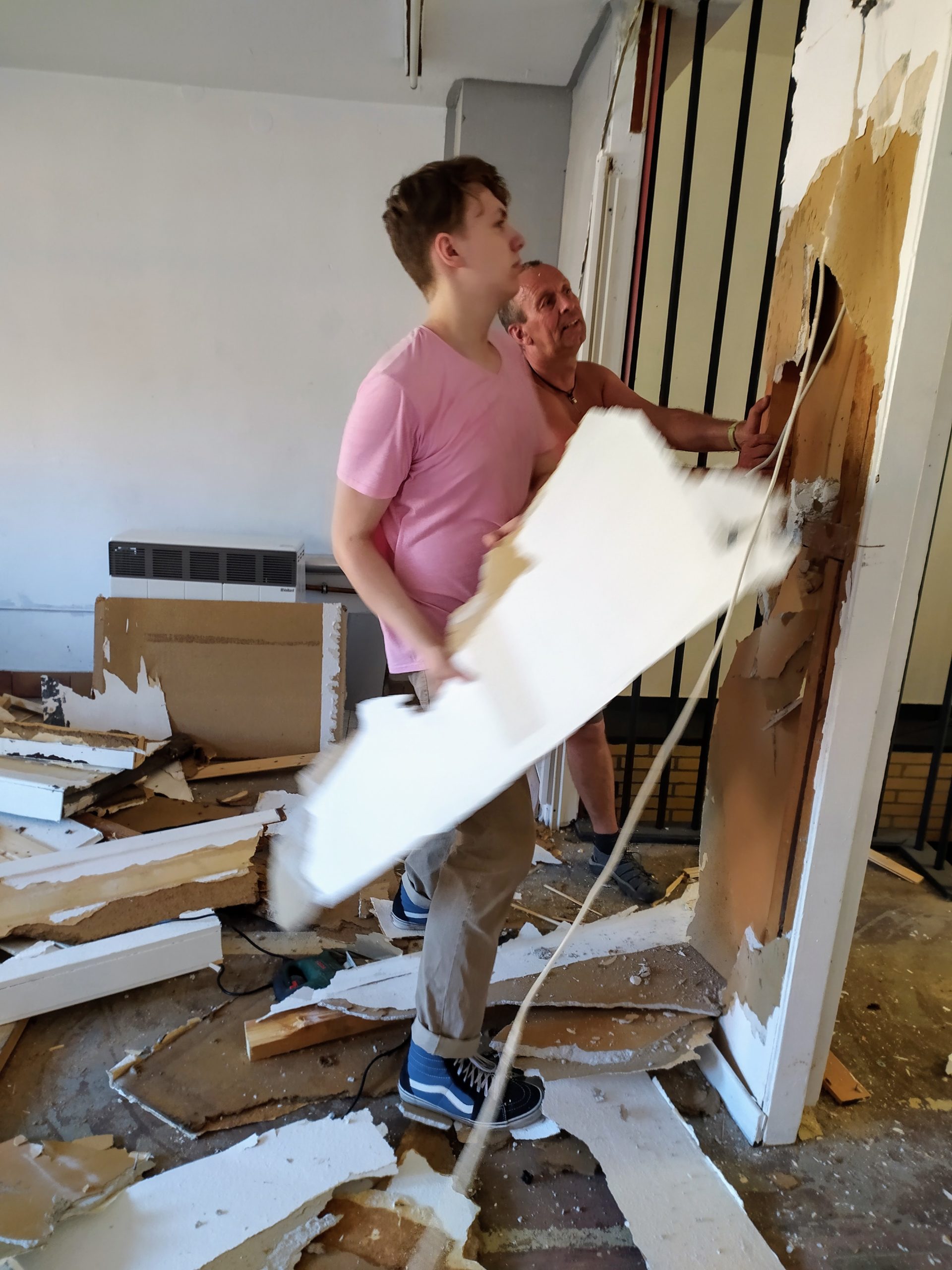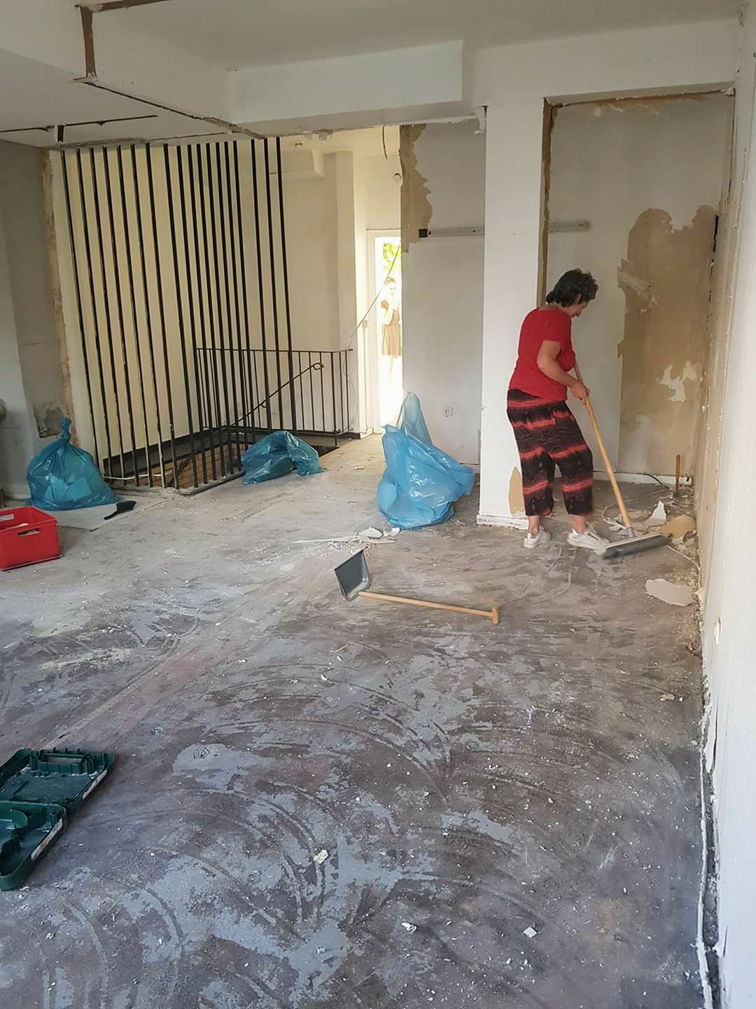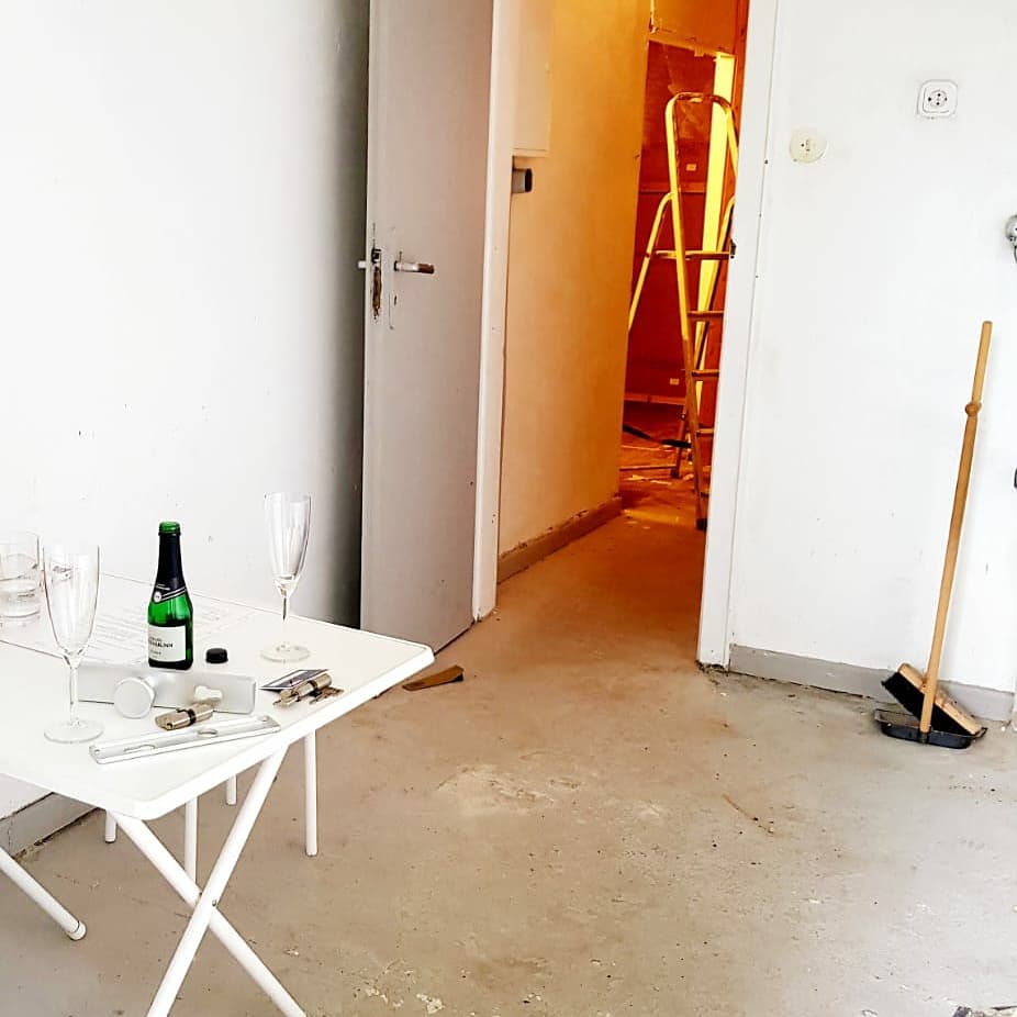 Symbolisch entfernen wir Spinnweben und Teppich, die Baustelle ist eröffnet. Wenn es soweit ist, dann sehen wir uns in der Preußenstraße 49 auf der Matte. Ihr seht, es wird noch ein wenig dauern.